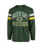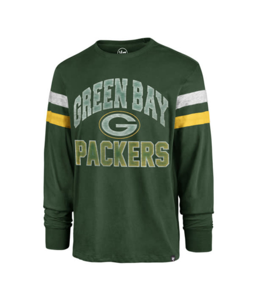 Distressed screen printed team graphic on center chest with printed sleeve stripes