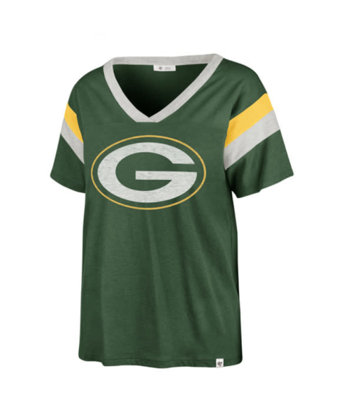 Short sleeved cotton v-neck t-shirt has printed graphics.